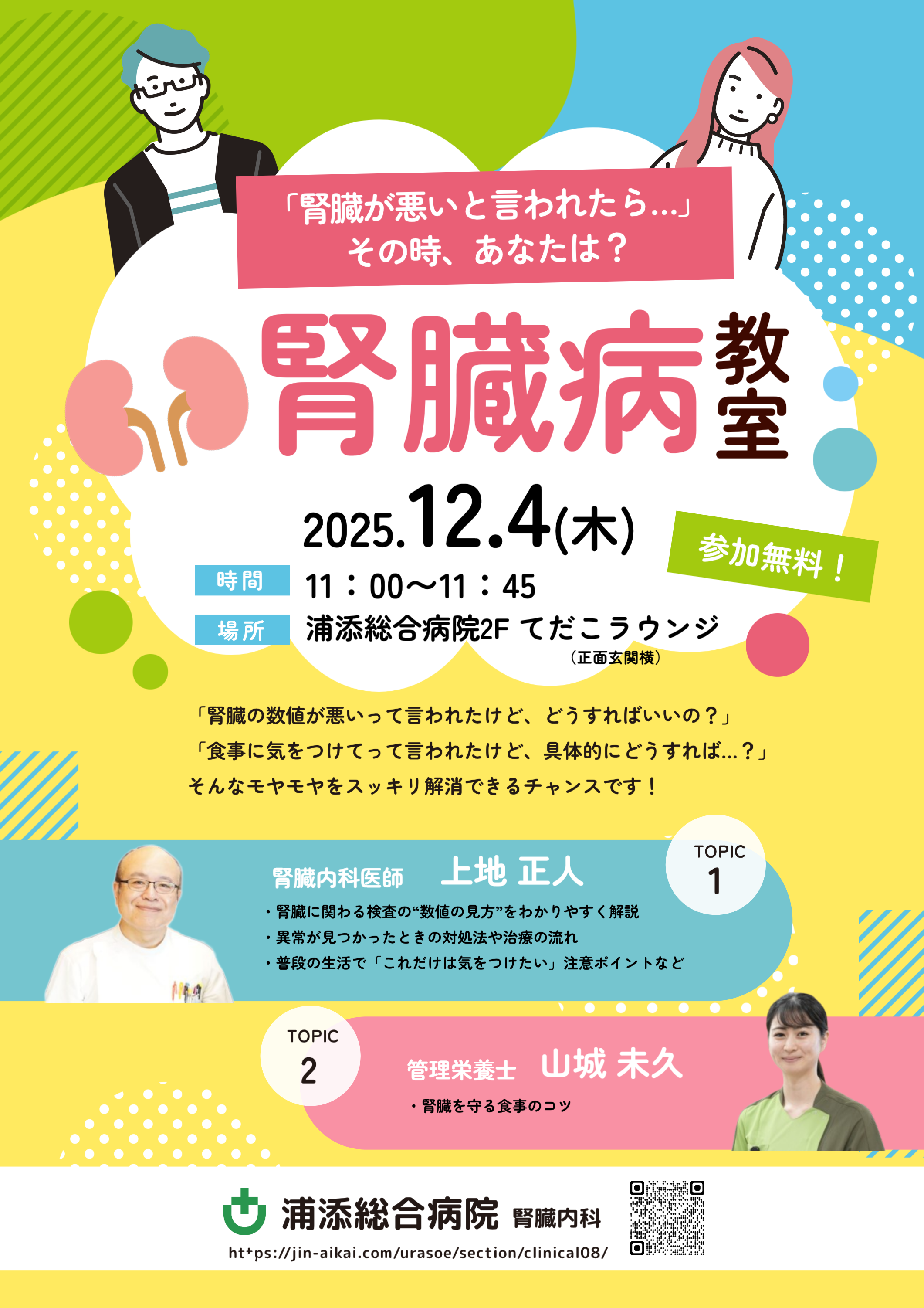 この度、「腎臓が悪いと言われたら…」をテーマとした腎臓病教室を下記のとおり開催しますので、お知らせします