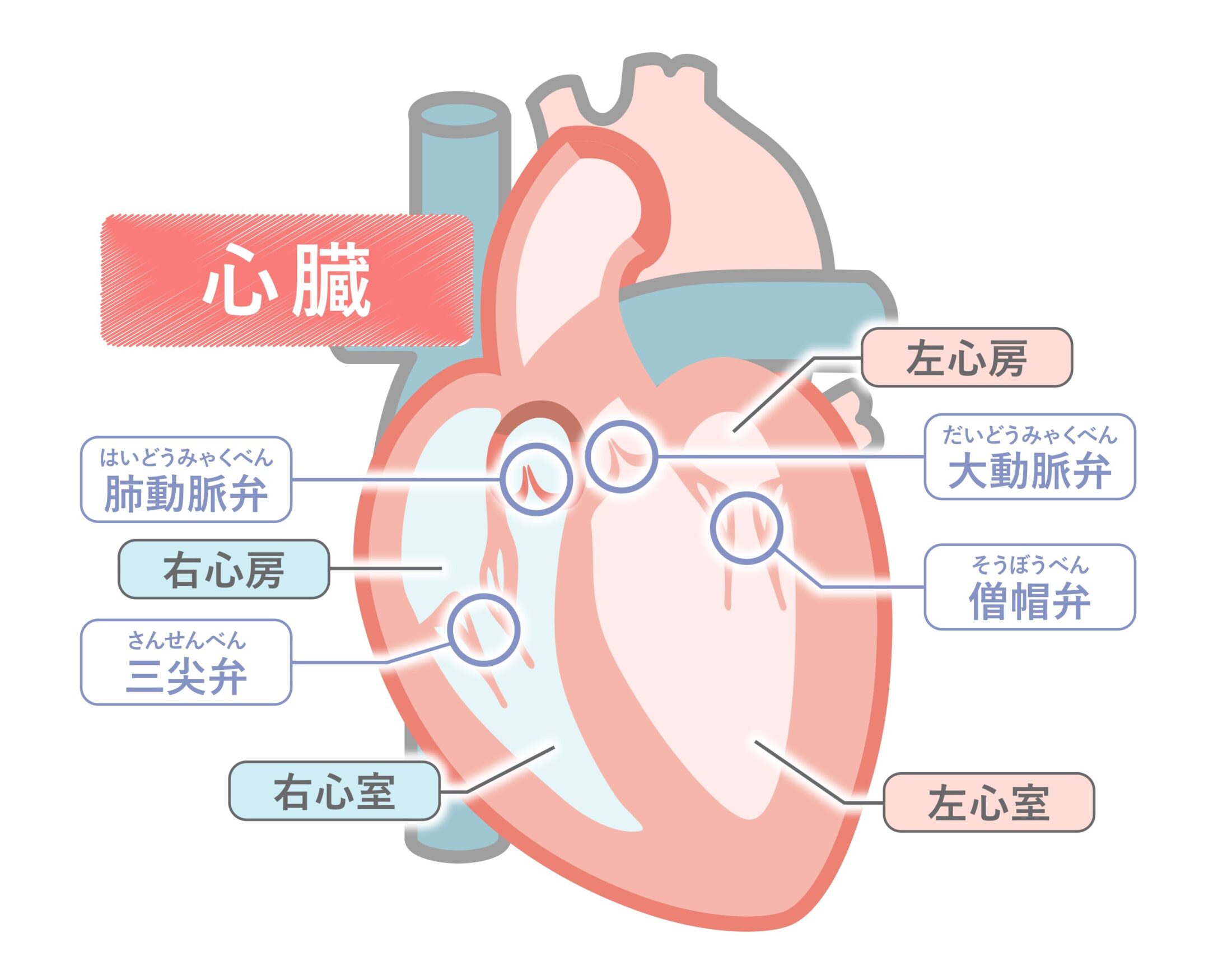 心臓には、血液が正しい方向へ流れるように調整する4つの弁があります。これらの弁が加齢や病気などで硬く狭くなったり、うまく閉じなくなると、血液が逆流したり心臓が強い力で働かざるを得なくなり、徐々に負担がかかります。この状態を心臓弁膜症といいます。