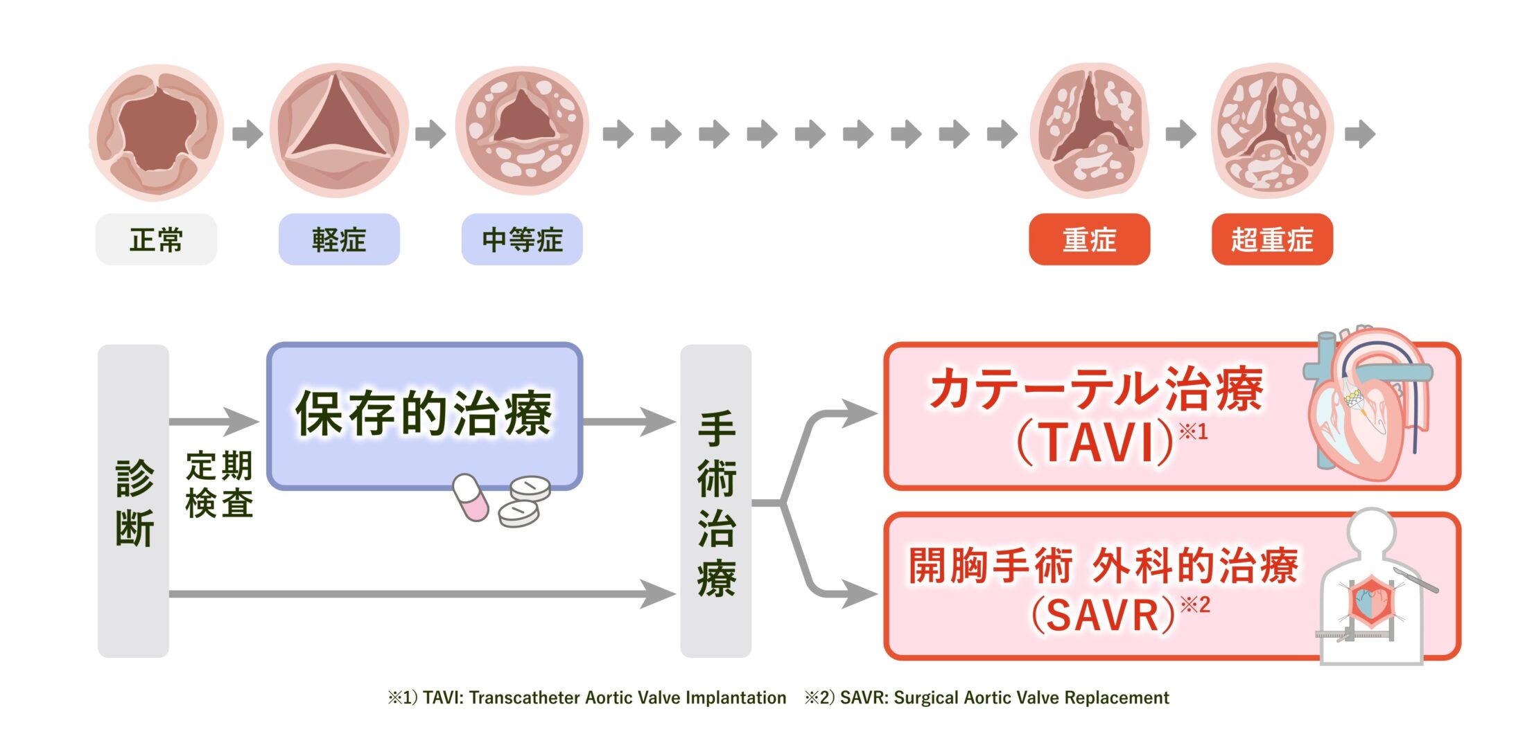 大動脈弁狭窄症は、心臓弁膜症の一つで、大動脈弁が硬くなり十分に開かなくなることで、心臓から全身へ血液を送り出しにくくなる病気です。進行すると、息切れ、胸の痛み、動悸、失神、むくみなどの症状が現れ、さらに悪化すると心不全や不整脈など命に関わる状態を引き起こすことがあります。軽症の場合は薬による治療で経過をみますが、重症の場合は外科的治療(大動脈弁置換術)やTAVI(経カテーテル的大動脈弁植込み術)などのカテーテル治療が選択されます。